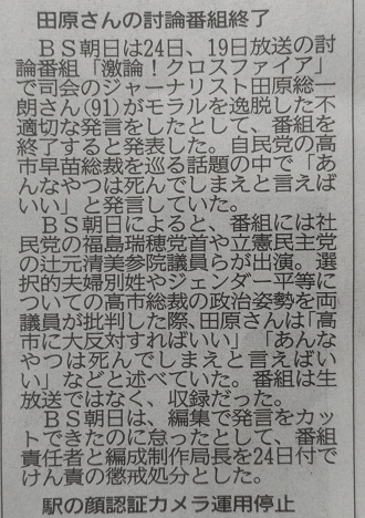 このページは2025年03月15日に設置されました。 放送打ち切りだと誤解していたが、Wikipediaで調べてみると、土曜日早朝(=金曜日深夜)から日曜日19:00-20:54に変更された事が分かった。 放送時間が3時間から2時間に減っている。 2022年01月@日記 27日@2024年06月@日記 これらの記事で私が詭弁話法を暴いた事への反応として、出演者に逆恨みされて放送打ち切りに成ったのだろうなあ、と思っていたが違った。 しかし、地上波からBSに変わっているので、私は見る事が出来ない。 私に論評されたくないから変えたのだろう、という私の推測は、やはり当たっているのだろう。 --- 2025_1026_1232 田原総一朗が暴言という新聞記事。 過去にもあったんだけどなあ、朝まで生テレビで、どこやらの官僚が自殺すりゃいいんだ、って言ってたよ、田原総一朗さんは。 「そのときゃ厚労省の役人が首くくりゃ良いんだよ」だったかな。 誰も問題にしなかった。 私は、番組を終了する必要は無いんじゃないか、と思うけど、問題なのは、失言という物をどれだけ責めるかが責める人の都合によって変わる事だ。 どこやらの官僚が自殺すりゃいいんだ、という発言も関係者の多くが気付いたはずだが、あの時は誰も何も視聴者に言わなかった、もちろん番組は続行でした。 「お前の失言を取り上げるも取り上げないも自分達のサジ加減ひとつなんだぞ、分かってるだろうなあ」という態度の勢力こそが真の権力であり、マスコミが権力批判を標榜するのなら、それを批判しろよ。 ![]() |