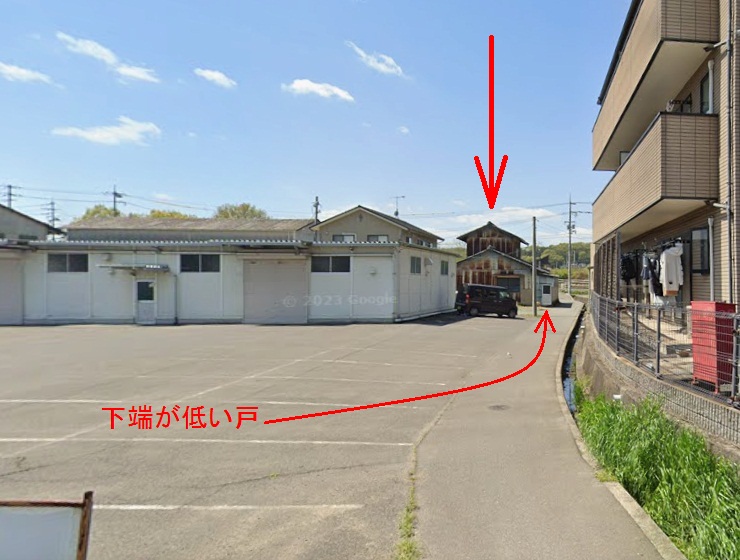 このように戸の下端がすり切りで通路に接している実例は、宇田雄一の自宅の南最寄交差点の北西脇民家の南側面や、狭通路を挟んで淀電子第1工場の南隣の民家の北東隅辺りにも見られた。