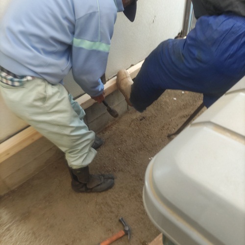 ウダマチコのプレハブ修理作業中。