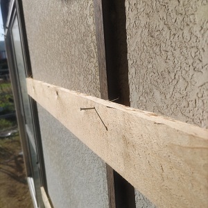 修理中のプレハブから釘が突き出されている。