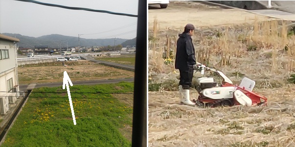 その少し後自宅西棟2階北窓から写真撮影しようとすると、耕運機は西に移動して淀電子の社屋で見えなくなる寸前だったので、写真撮影は出来なかった。