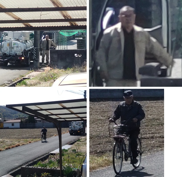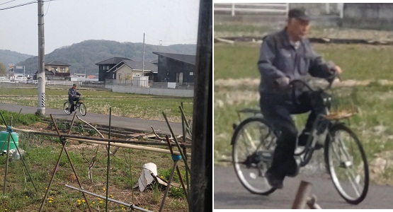 私が耕運機の男を撮影していると、また自転車が到来した。