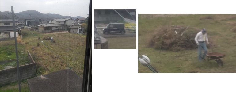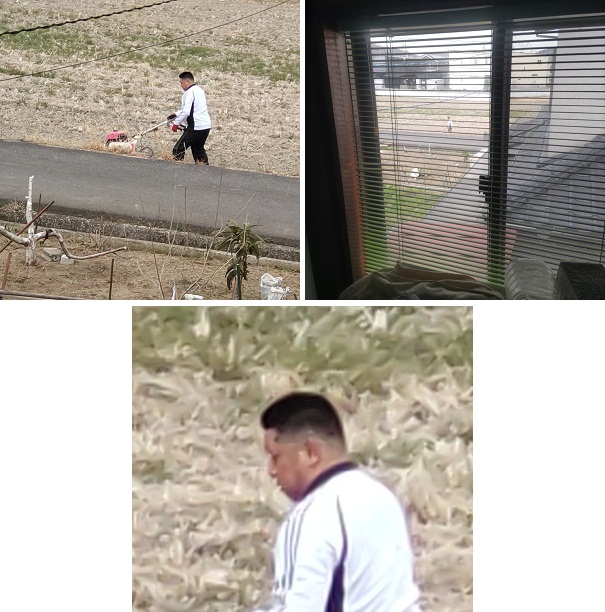 いま自宅西棟2階室内で起床直後着替え中の私に写真の耕運機の稼動音が聞こえ始めた。