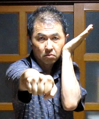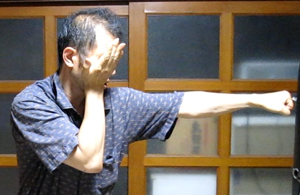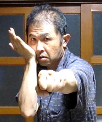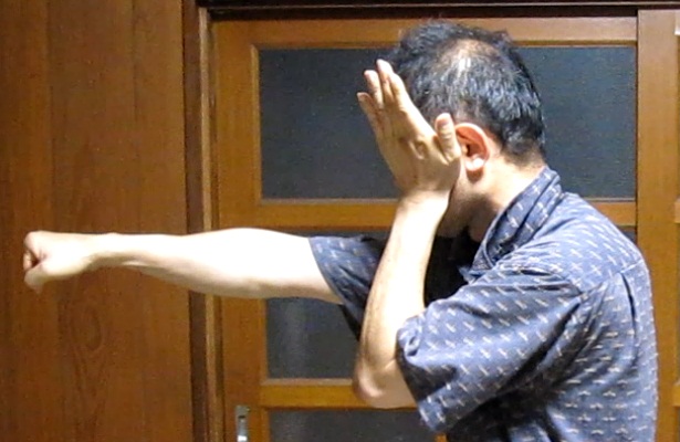 右に向けばストレート・パンチを免れる範囲が拡大する。 こめかみは露出しているが、敵の正拳の指がガード手に当たって打てない領域がこめかみ付近に結構有る。