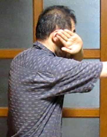 右肩がきつい。 右肩を楽にすると自分の親指で自分の目を突く危険が有る。