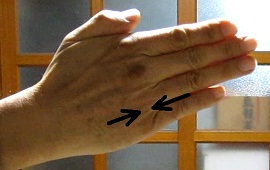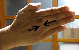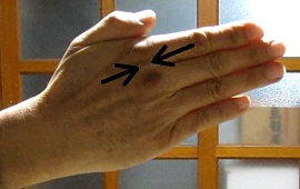 中指の付け根の関節と薬指の付け根の関節の間の窪み。