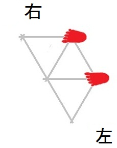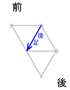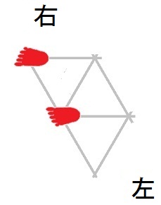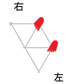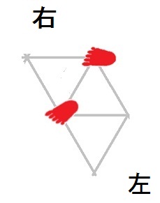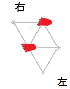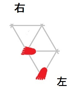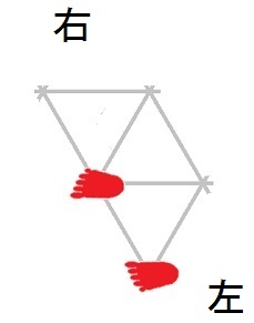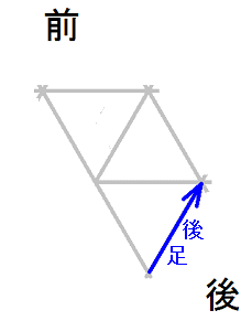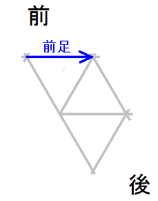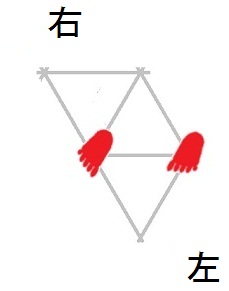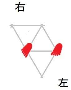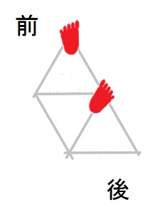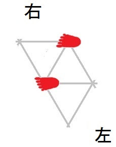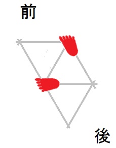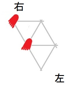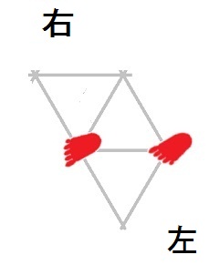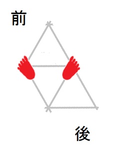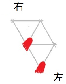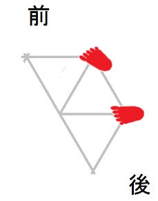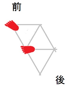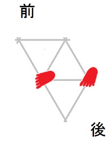 発案当初は直進をホバーとは独立のモードと考えていましたが、2025年12月15日に、直進は縦切替の繰り返しである、という風に、直進をホバーと遷移の組合せとして認識する分類法に改定しました。 直進を縦切替の繰り返しだと認識する事によって、それまで考え落としていた、以下の可能性に気付きました。 縦続行切替で逆回転ホバーをつなぐと、第6状態→第5状態→第4状態=第6状態→第5状態→第4状態=第6状態→・・・と成って、これでも前進できる。 縦続行切替で順回転ホバーをつなぐと、第4状態→第5状態→第6状態=第4状態→第5状態→第6状態=第4状態→・・・と成って、これでも後退できる。 これらは、胴の向きを微調整すると、普通の歩行と足の左右幅が少し違うだけです。 直進前進は順回転ホバーとしか、直進後退は逆回転ホバーとしか馴染まない、という固定観念が間違っているかもしれない。 私は、ホバーのどちらを順回転とするか、どちらを逆回転とするかを、それで決めていたんだけど。 四つ足の構え(直進), UWV20220613. 2022年06月13日発案。 ![]() 進行方向を基準にすると、この運足は前足と後足がずっと入れ替わらない。 最初右足が前足で左足が後足なら、その後もずっと右足が前足で左足が後足のままだし、最初左足が前足で右足が後足なら、その後もずっと左足が前足で右足が後足のままです。 前足と後足が縦(前後方向)に並んだ状態を基準にして、そこから先に後足を動かし、次に前足を動かします。 その際の後足の行き先は1歩前の前足の位置で、前足の行き先は後足の真ん前です。 後足がリードしてレールを選択し、その後で前足を後足のレールに引き寄せる、と考えると覚えやすい。 こうして後足と前足を1歩ずつ動かすと、また前足と後足が縦(前後方向)に並んだ状態に成ります。 私はスケートボードをやった事がありませんが、スケートボードの使い方のエッセンスには、こういうのが含まれているのではないだろうか。 進路の延長上に敵が居る様に進む選択も有り得ますが、それでは敵から見てこちらの前足と後足が入れ替わらないし、足の動きの規則性も見破られやすい。 だから、敵に向かって直進するのではなく、敵より少し左または右に向かって直進するのが実用的だと思われます。 敵より少し左に向かって直進前進する場合は胴の向き=右とし、敵より少し右に向かって直進前進する場合は胴の向き=左とします。 左足を前足、右足を後足にしたAFS基本姿勢に近いのは胴の向き=右の場合です。 右足を前足、左足を後足にしたAFS基本姿勢に近いのは胴の向き=左の場合です。 ![]()
