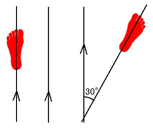 後足の爪先の向きは、力まず胴を出来るだけ前に向けようとした時に自然に到達する向きです。