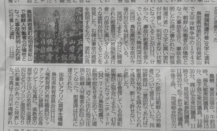--- 2025_0913_1248 鳥取県岩美町の旧岩美鉱山で朝鮮人労働者らが犠牲となった事故を説明した石碑の「被強制連行者」という文字に塗料。 強制連行は無かった、という抗議の意味だろうか、それとも証拠隠滅だろうか。 強制連行が一度明るみに出た事実かどうかは私は未確認です。 ![]() --- |