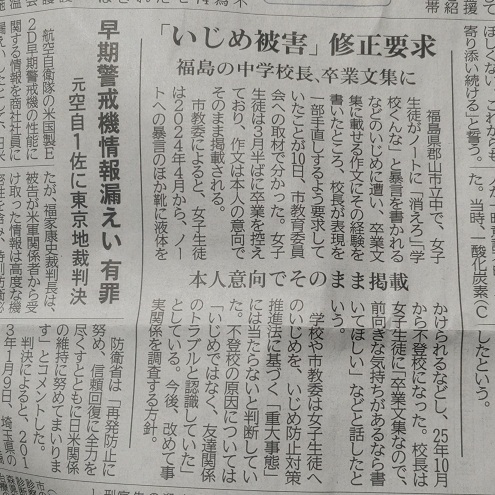 生徒が卒業文集に載せる作文にいじめ被害の経験を書いたら、校長が表現を一部手直しする様に要求した、という話。