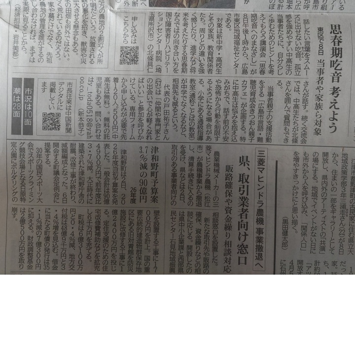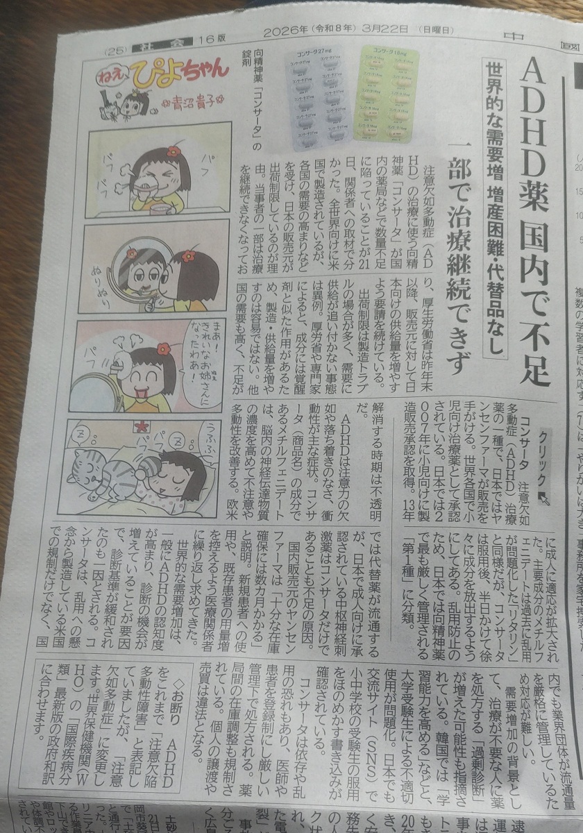 2026年春時点から見て近年、吃音が有れば治せよ、という意味の呼びかけをテレビで何回も見た。 そのたびに私が自分のウェブ記事で注意を呼びかければしばらくまた息を潜める、という事が繰り返されているようにも見える。 拒食症や潔癖症や発達障害についても用心が必要だ。 これらは、治療を受ける本人が望まなくても、本人以外の人が本人に治療を強制する事が出来る様にしてしまおう、という動きです。 既にそう成ってるかもしれないので、大変危険です。 精神病の強制入院を手本にしている、と思われます。 2026年01月22日に死去した将棋の加藤一二三さんに、吃音を治す事を強要したらどう成ったでしょうか。 将棋が弱くなったかもしれませんよね。 それが敵の狙いなんですよ。 また、加藤一二三さんには、吃音を治せという話がどうして出なかったんでしょうか。 それは、治す必要が無いからです。 そういう、もともと必要のない事を必要だとこじつけて医薬の市場を敵が開拓しようとしていると考えられる。 --- 2026_0305_1103にメモした。 広島市東区で吃音啓発講演会が開かれた、という新聞記事。 ![]() --- 2026_0323_1125にメモした。 注意欠如多動症の治療に使うADHD薬、向精神薬「コンサータ」が国内で不足しているという新聞記事。 不足してるって事は、それだけ投与されたって事でしょ? そんな馬鹿な。 注意欠如多動症なんて病名、いま初めて知ったよ。 次の様に書かれている。 日本の販売元が出荷制限している事が不足の原因。 各国の需要の高まり(これが出荷制限の原因と成るのは異例)と日本では代替薬が無い事が原因で日本の販売元が出荷制限している。 世界的な需要増加の原因は、ADHDの認知度が高まり診断の機会が増えている事と、診断基準が緩和された事だとされる。 治療が不要な人に処方する「過剰診断」が増えた可能性も指摘されている。 ![]() 新聞をスマホで写真撮影したとき、福山586る1215北進通過。 福山530せ2271南進通過。 福山580ま6264南進通過。 --- |