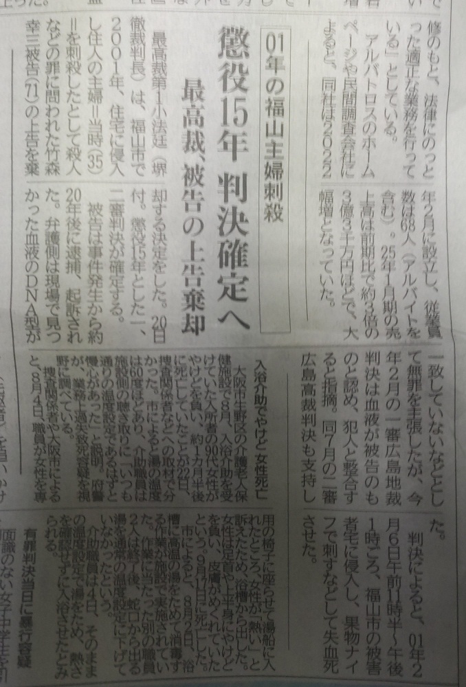 2013年12月@日記 この回のケーサツ襲来の日は、福山こころの病院(福山仁風荘病院)で外来受診を終えた私が病院参道を歩いている途中で危険運転車両の攻撃を受け、その車両に乗っていた人が警察を呼んだ結果、私が警察の職務質問を受けるハメに陥った物ですが、この日は、登院前に珍しく明王明王台で路線バスを降車しました。 明王台でバスを降りたのは、その時1回だけだったと思います。 いつもは、普段は、国道2号線のバス停でバスを降りていました。 私が明王台のバス停でバスを降りた日に警察が私に来た事は、福山市明王台主婦殺害事件と関係が有るだろう。 職務質問で警察官は私に「我々はずっとあなたを探していたんだよ」と言いました。 不審人物がうろついている、という通報を受けたのだと思う。 明王台は、それ以前にデイケアで何度もレクリエーションに連れて行かれました。 私がその日バスを明王台で降りたのも、その事を懐かしく思い出したからです。 しかし、いま思えば、デイケアの職員が私を含む被ケア者を明王台の公園に連れて行ったのも、福山市明王台主婦殺害事件で私に冤罪する計画の一部だった事を強く疑っています。 デイケアの職員に連れられて被ケア者集団の1人として明王台の公園に何度か行った中には、1回だけ、展望台と言ったかなあ、住宅地の奥深くに歩いて入って行った回が有りました。 後日もし私がそこを懐かしんで1人で展望台まで歩いて行ったら、福山市明王台主婦殺害事件の犯人に見えるんじゃあないかなあ。 竹森幸三被告が逮捕されたのは2021年、福山こころの病院への私の通院最終日は2023年末だから、私に冤罪するチャンスが無くなったので用済みに成った福山市明王台主婦殺害事件を片付けた、という見方はピッタリではないけど、2021年頃には既に私が明王台に1人で歩いて行く事はもう無いだろう、という状況に成っていた、とは言えます。 私は2016に心身の調子が著しく悪化するまでは1人でバスに乗って通院していましたが、2016年に心身の調子が著しく悪化してからは、回復した後もずっと、父ウダオサムの自動車で通院しました。 だからです。 竹森幸三被告が逮捕されたニュースをテレビか新聞で見るまで、福山市明王台主婦殺害事件を全く知りませんでした。 私が言いたいのは、冤罪事件というのは、過失ではなく故意の犯罪であり、冤罪される特定の個人を狙ったものであり、殺人事件もその為に起こされている疑いが有る、という事です。 福山市明王台主婦殺害事件で言うと、私に冤罪する目的で何者かが明王台の主婦を殺した、そう私は疑っています。 私の住所の近所でイトウという名前の人が変死した事(2022年11月@日記)や、不審火があった事(21日@2023年11月@日記)で、ますます私はそういう疑いを強めています。 --- 2025_1026_1455 01年の福山主婦刺殺事件に懲役15年判決確定という新聞記事。 袴田事件と立証の確実さのレベルを比較してみる必要がある。 犯人を間違えてさえいなければいい、という問題ではない。 弁護側はDNA型が一致していないと主張したが判決は血液が被告のものと認めた、と書かれている。 DNA型は一致していたのだろうか。 とにかく、この事件は私を狙ったものだろうから、簡単ではないと思うよ。 何重にも落とし穴が作ってあって正解に辿り着けないようにしてあるとか、そういう心配が有る。 警察と裁判所は、大丈夫なんだろうなあ。 また袴田事件の様な事を繰り返したら、今度はどういう話が出るんだろうか。 ![]() |