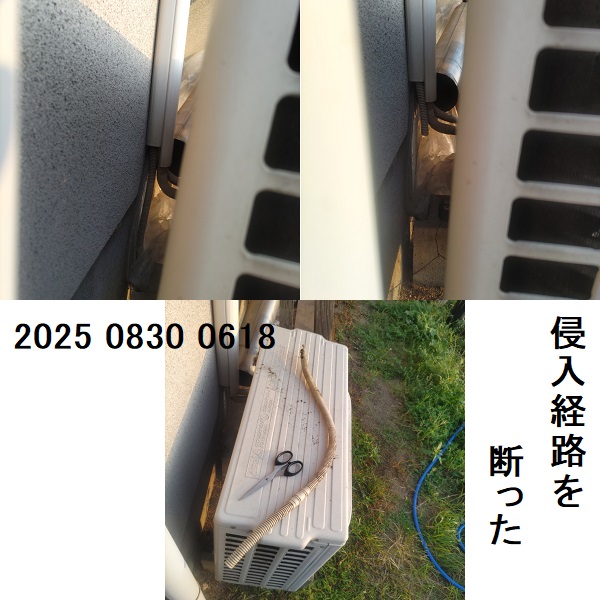 | 2025_0830_0618 | エアコンのドレインのホースを私が途中で切断して、ホースの下端が地面に届かない様にした。 このドレイン・ホース・下端の位置は、自宅母屋1階居間東脇屋外です。 これは、2025_0418_1855に「福山580つ7876」が不審停車していた位置と大体同じです。 ![]() |