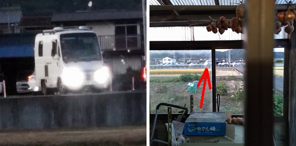 歩道にこちら向きに停車してヘッドライト照射。撮影に反応して歩道西進で逃げた。