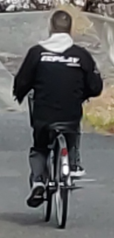 自転車、灰色服 |