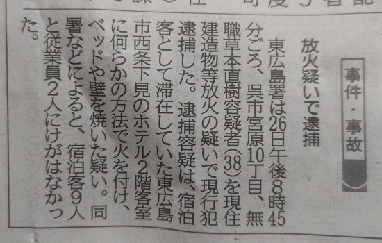 2025年春時点では、もう何年も前から、放火の手口は漏電火災を引き起こす手口に成っているだろうと私は感じている。 古くはアメリカ合衆国でのアポロ1号の火災から既に怪しい。 火災前の宇宙飛行士と火災後の宇宙飛行士のタイプが違えば、その事が動機だろうと私は思う。 2025年04月上旬に新聞記事を見て私は、原因は過失だと言いくるめながら漏電火災を引き起こす手口が増強されつつある、と思った。 ![]() --- 2025_1018_1236にメモした。 車庫に駐車していた軽乗用車をカセットコンロで放火し、民家に燃え移らせようとした、不起訴。 ![]() --- 2026_0129_0942にメモした。 東広島市のホテルで放火疑い ![]() --- 06日@2023年12月@日記 ・・・ 自宅母屋1階居間の電源タップに放火工作か |