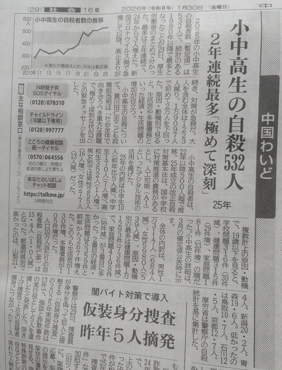 --- 2025_1001_1236にメモした。 福山同級生刺傷 元生徒の少女を医療少年院送致 という新聞記事。 医療措置が必要とする根拠は何だろうか。 病気が原因で犯行した事件には見えないが。 ![]() --- 2026_0131_1019 小中高生の自殺 原因・動機に健康問題が多いようだ。 と書かれている。 私は、以下のような疑いを持った。 精神病冤病の被害を苦に自殺じゃないのか。 健康問題と言われると精神病だとは思わない人が多いだろう。 また、冤病の被害なら犯罪の被害であって健康問題でもない。 こうやって、誰も疑わないようにするもみ消し工作が何重にも入っているのではないか。 ![]() --- |