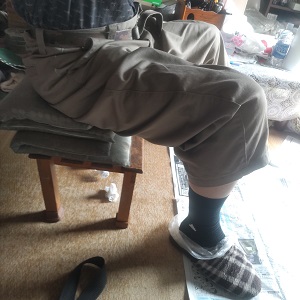 自宅母屋1階居間で私が座っている椅子の脚が下すぼみで倒れて危ない