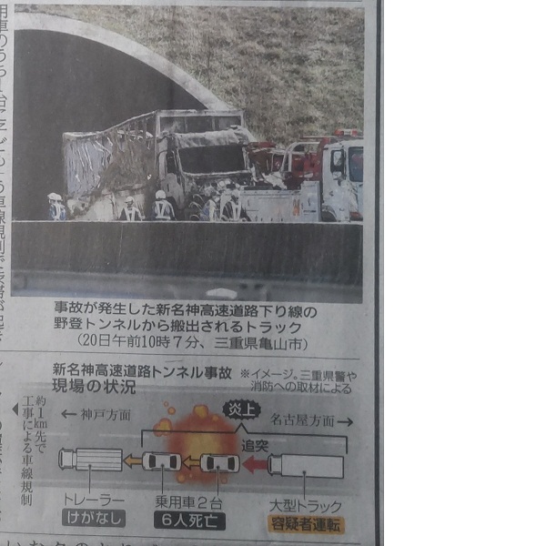 2026年03月20日午前02時20分頃、三重県亀山市安坂山町の新名神高速道路下りの野登トンネル出口付近で、大型トラックが乗用車に追突するなど車4台が絡む事故?が起き、火災が発生し6人が死んだ事を報じる新聞記事に以下の写真と図が掲載されていた。