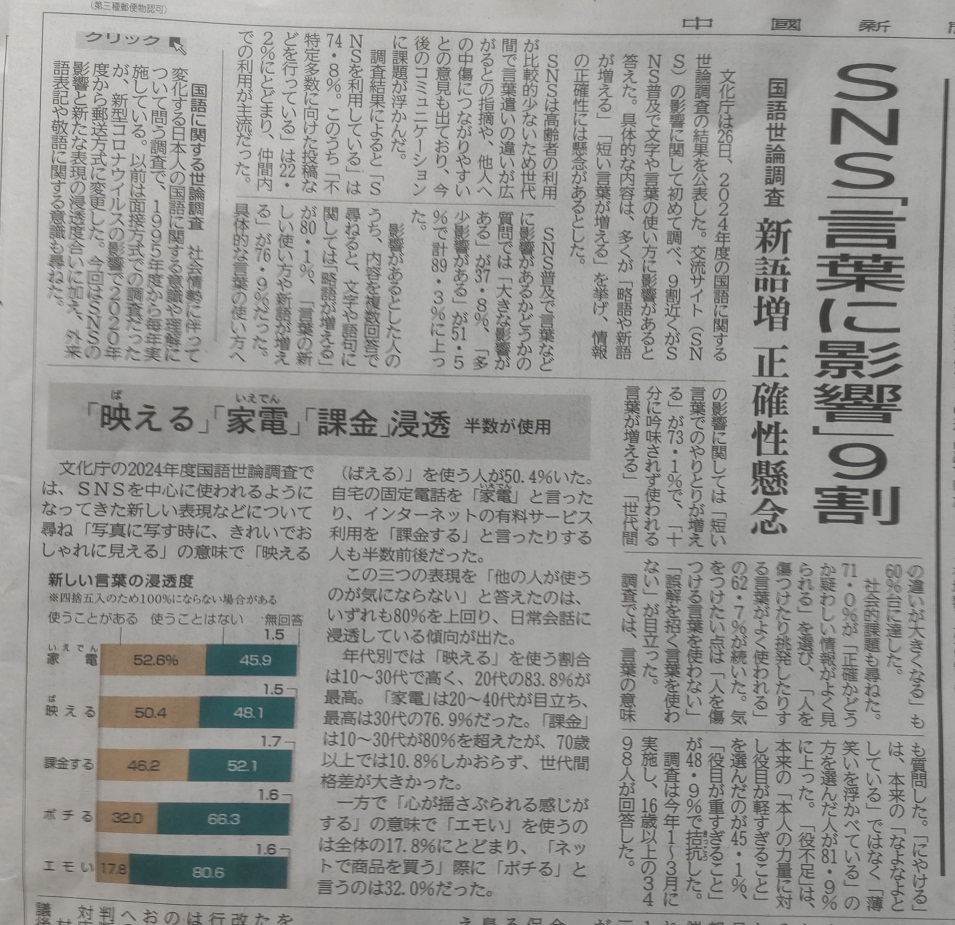 2024年末までに「神ってる」という新語を聞く事が多く成っているが、「神がかってる」という言葉が元々あるので、「神ってる」という言葉を新しぶって使う様子はうるさい。 --- 2024年末までに「難しい」を「むずい」と言う人が増えているが、「むずい」ではムズムズとかゆい事と混同する恐れがある。 それを狙った集団ストーカー工作だろうか。 心身の感覚を表現する擬態語は敵に狙われているだろうから注意が必要である。 --- 2024年末までに「ばえる」という言葉を聞く機会が増えている。 聞く度に脳に膠原反応か何か嫌な感覚が生じて、ものすごくうるさい、嫌がらせでやってるんだろうなあ。 「映える」という言葉が元々あり、「はえる」と読む。 「映え」が「ばえ」と発音されるのは、複合語において後続語の語頭の清音が先行語との結び付きによって濁音に変化する音便現象においてであり、単独で用いられる「映え」を「ばえ」と発音するのは間違っている。 「見映え」は「みはえ」ではなく「みばえ」ですよね。 したがって、「ばえる」は新語ではなく、既存の単語の誤読です。 2025年09月28日にメモした以下の新聞記事で「ばえる」が取り上げられているのに、音便現象への言及が全く無い事は、極めて不可解である。 社会的記憶喪失なのか。 ![]() |